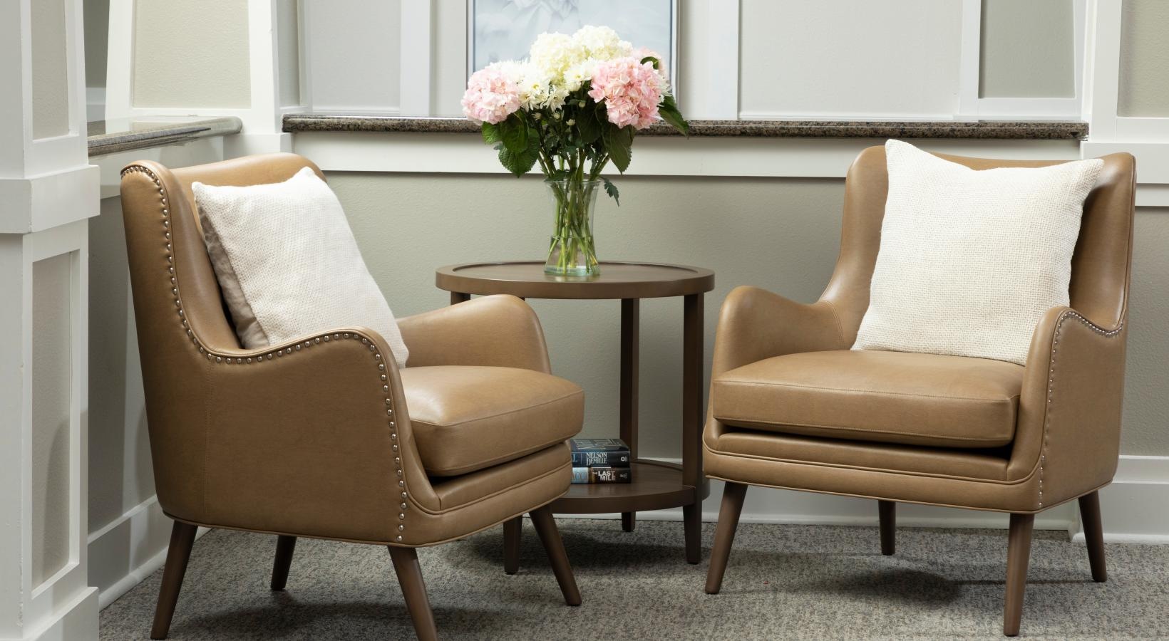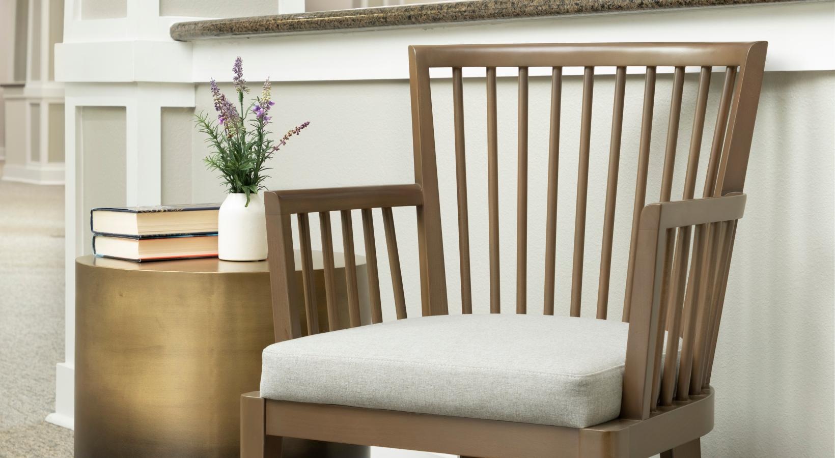 • chair and side table in well lit clubhouse