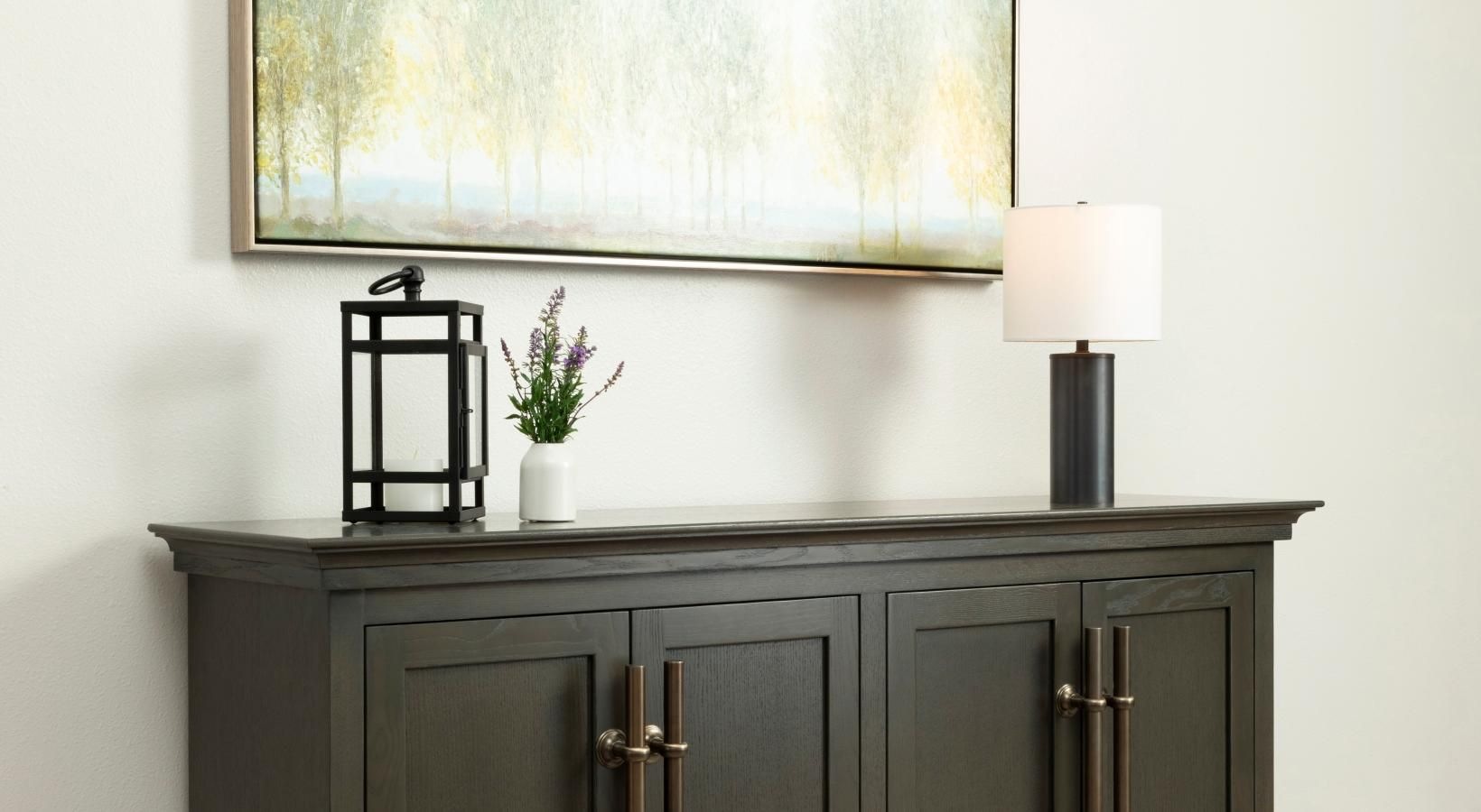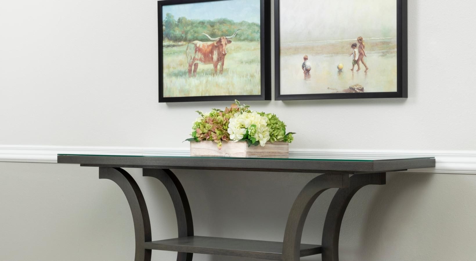 • room with a console table and framed wall art