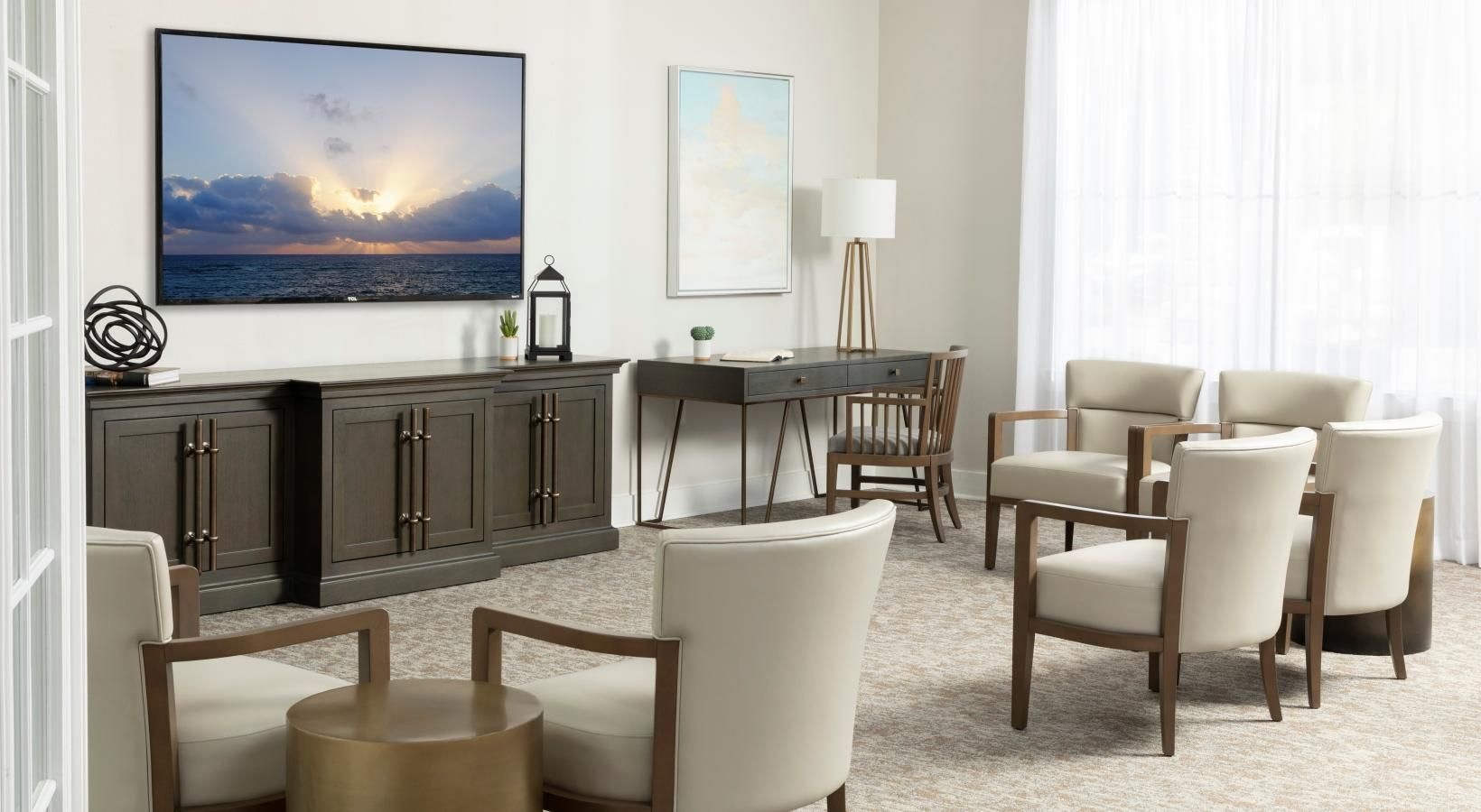 • wall mounted tv and chairs in bright clubhouse