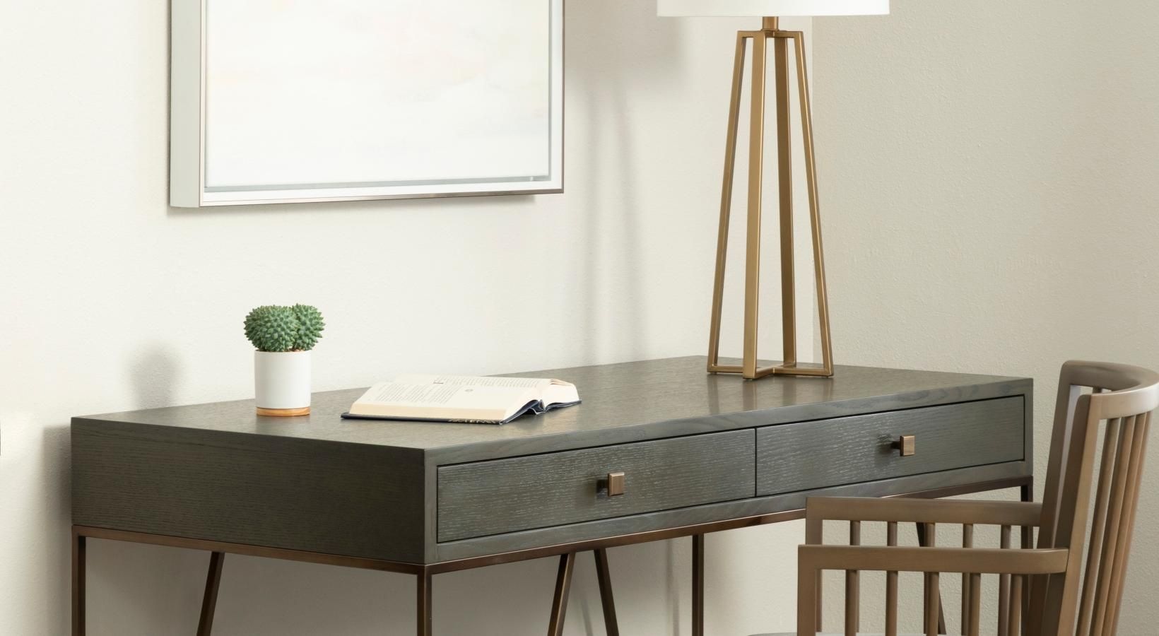 • a desk with a lamp and a chair in bright room