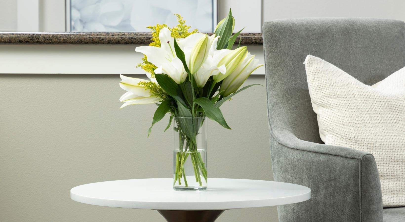 • a vase with flowers on a table