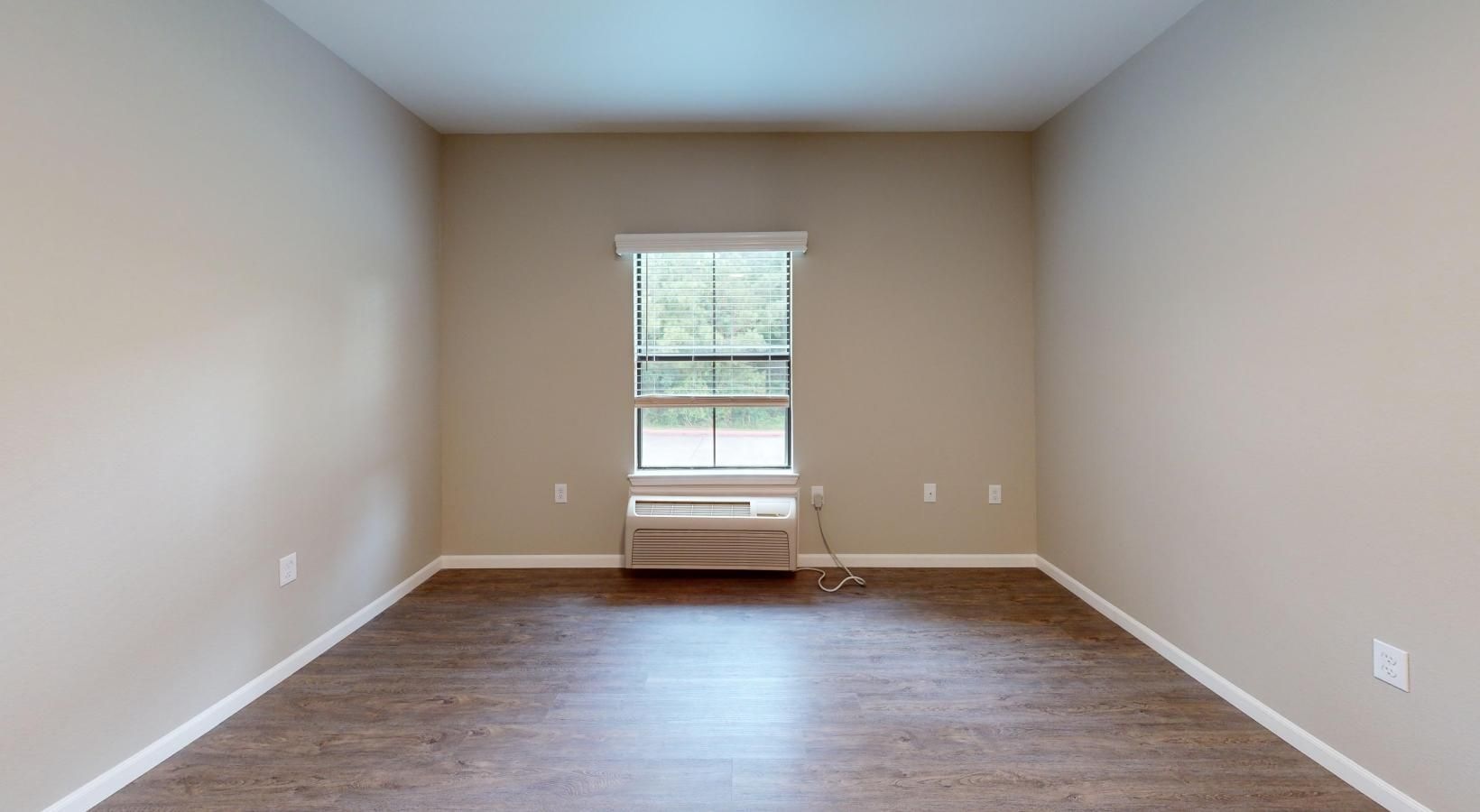 • large room with bright window and wall mounted ac unit