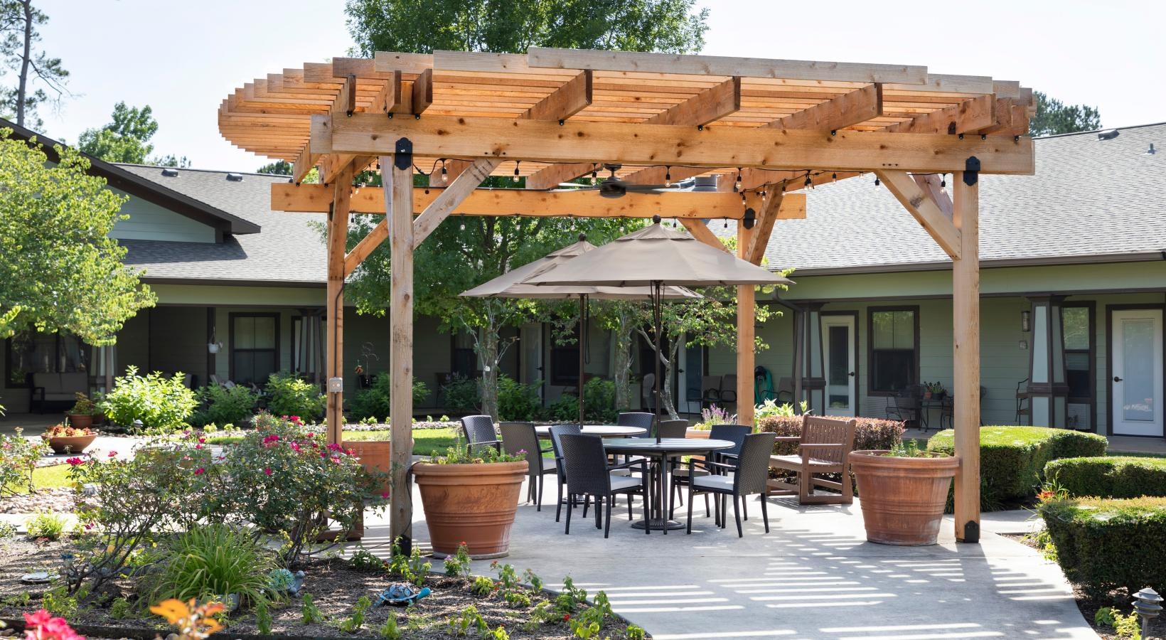 • outdoor patio with pergola covered tables and chairs