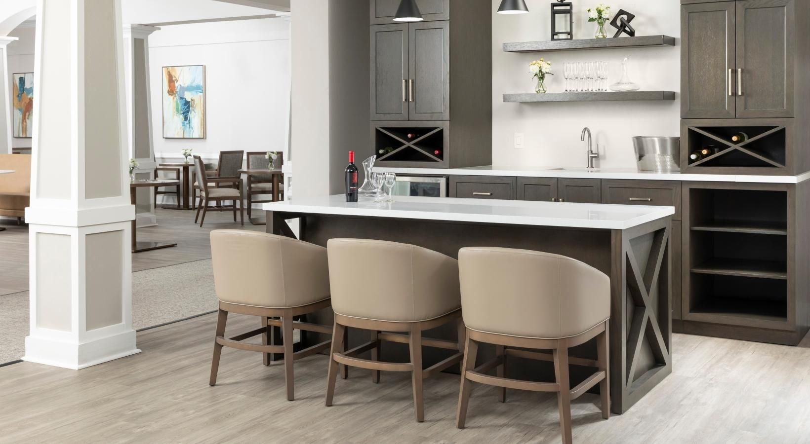 • clubhouse kitchen with an island and chairs